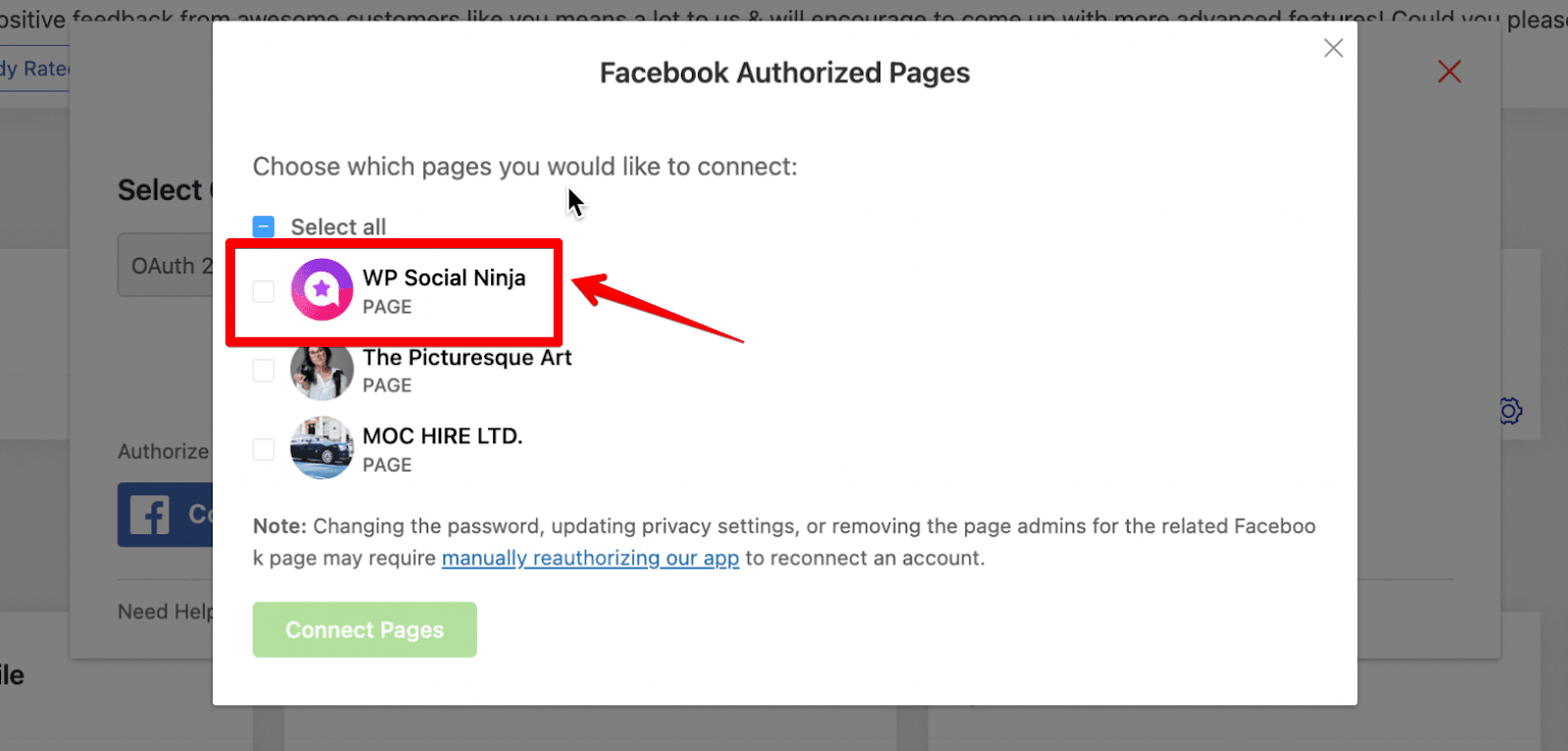 - You have linked with WP Social Ninja! Click OK to go further. Now, in this stage, select All Accounts or the specific ones and click on the Connect Accounts button