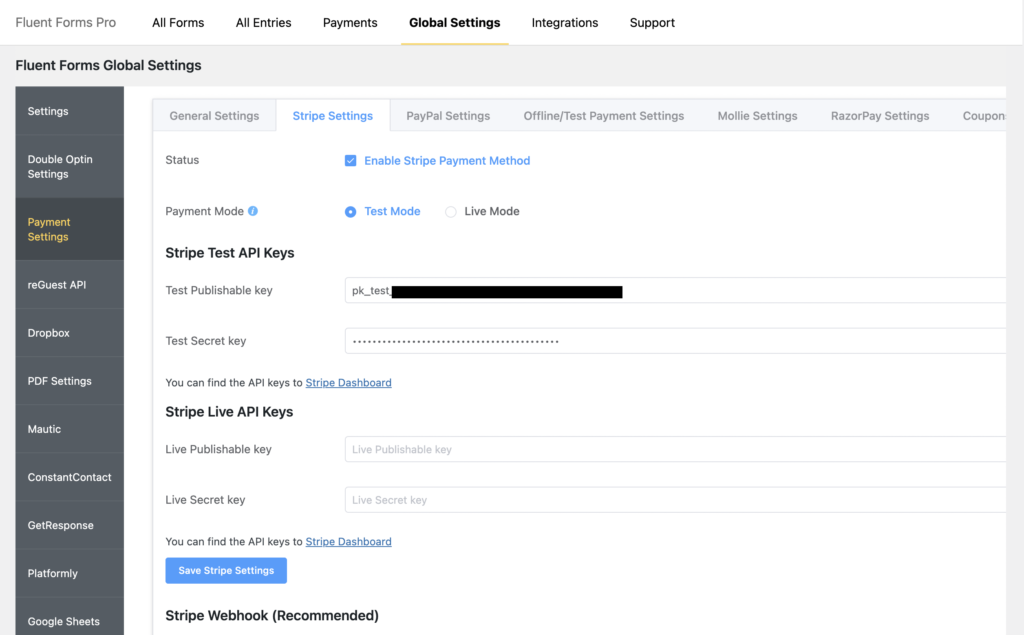 Using the Stripe integration for Fluent Forms, you need to sign up for Stripe if you don’t have an account already. Your site must be on SSL because of the security of credit cards. If you already have a Stripe account, copy the Publishable Key and Secret Key and paste them in the WP Fluent Forms Stripe settings panel.