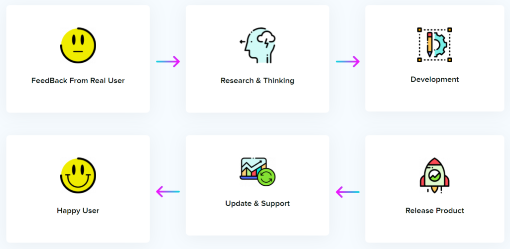 Here’s what the picture doesn’t tell you. If the users, or beta testers, aren’t happy with the product, we go back to the research and thinking stage and redesign the product. The cycle continues unless WPManageNinja achieves what it’s supposed to.