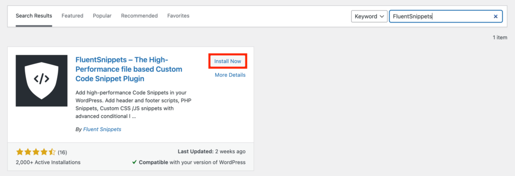 Go to Plugins > Add New Plugin and search for FluentSnippets.