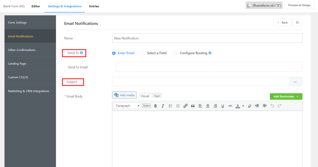 Name email notification, select Enter Email for the Send To option, define subject one, and so on. Use the drop-down menu to add data from your submitted entries. Customize your email body any way you like. Use shortcodes for convenience, and for a more advanced experience, you can use HTML codes from the text app.