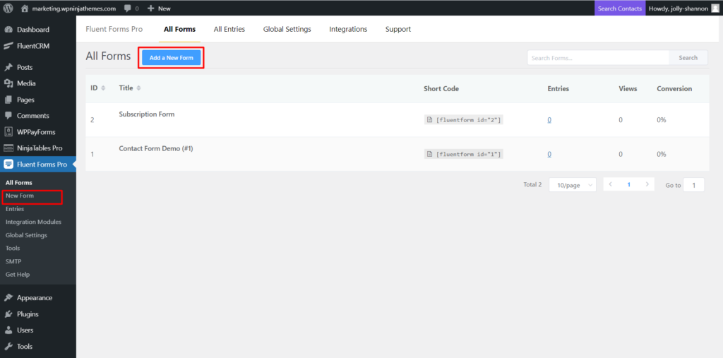At first, go to the Fluent Forms menu that appears in the left sidebar of your WordPress dashboard. When you’re there, you can either select the Add a New Form button or New Form from the left sidebar.