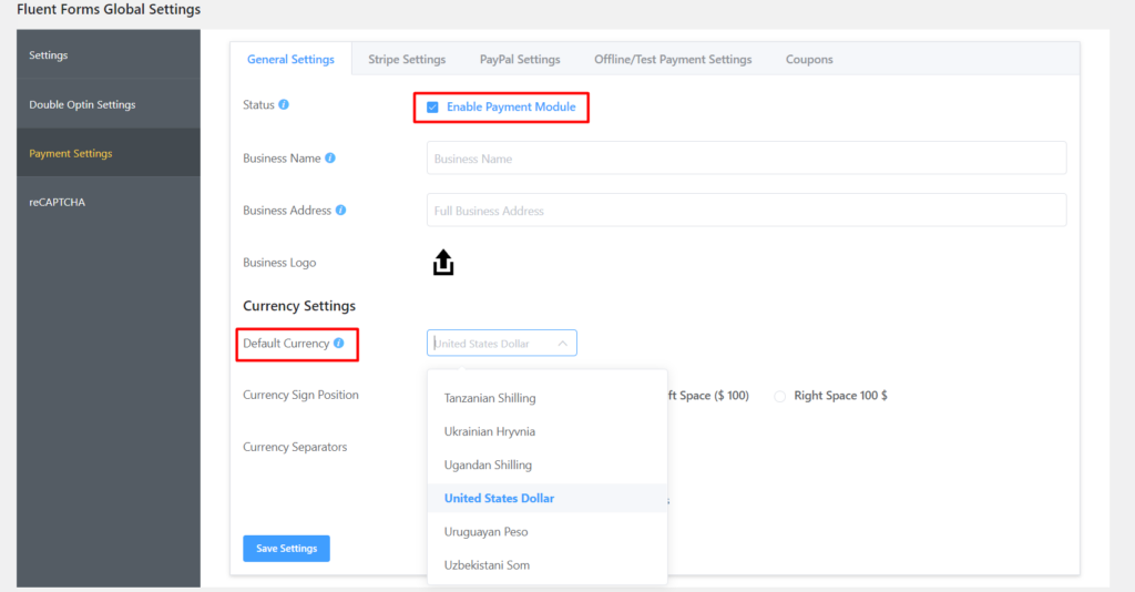 After that comes the Currency Settings. Use the dropdown menu to set your Default Currency.