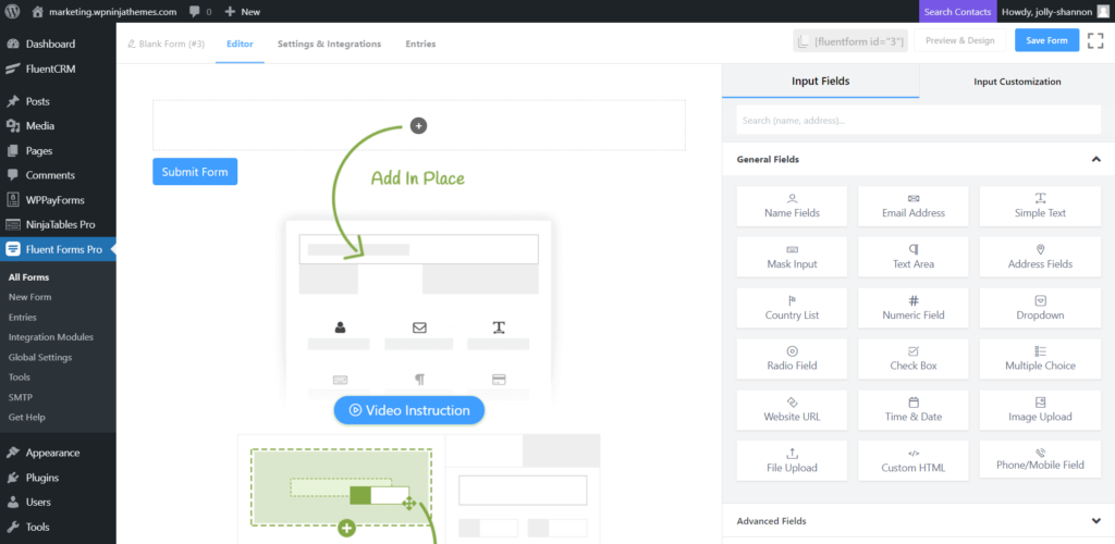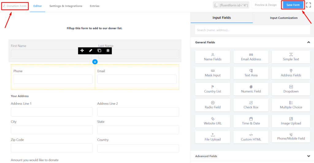 Now you can add input fields and also customize them without any coding. It’s a no-brainer. Just add a name, email, phone, and address fields one after another. You can customize fields whenever you want. Hover over the field you want to customize and click to get access to Input Customization.
