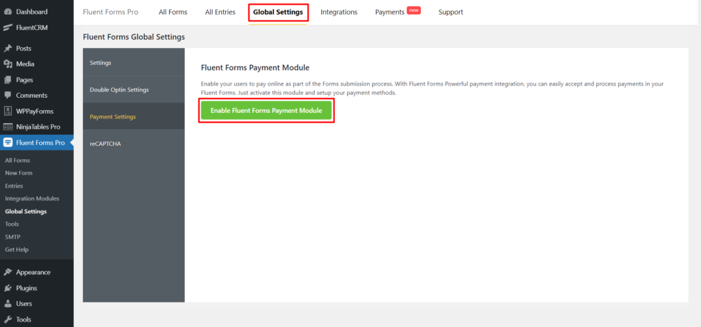 Configuring payment settings is pretty straightforward with fluent forms. First, go to the Global Settings from the dashboard, and then from the left sidebar, select Payment Settings.