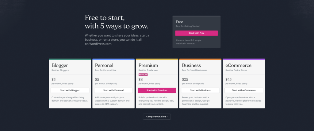 - As long as you’re using free websites, WordPress.com has several bitter things for you. For example, they show ads on your website and they will get the revenue earned with these ads. To remove these ads for your users, you have to switch to a paid membership plan. The plan starts with $36 per year.