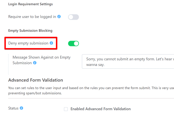 You can limit the form by enabling “Require user to be logged in” option. Users who aren’t registered can’t submit the form anonymously. This way, you can track further the people who are already in your network. Spammers won’t follow the path that requires hard work.